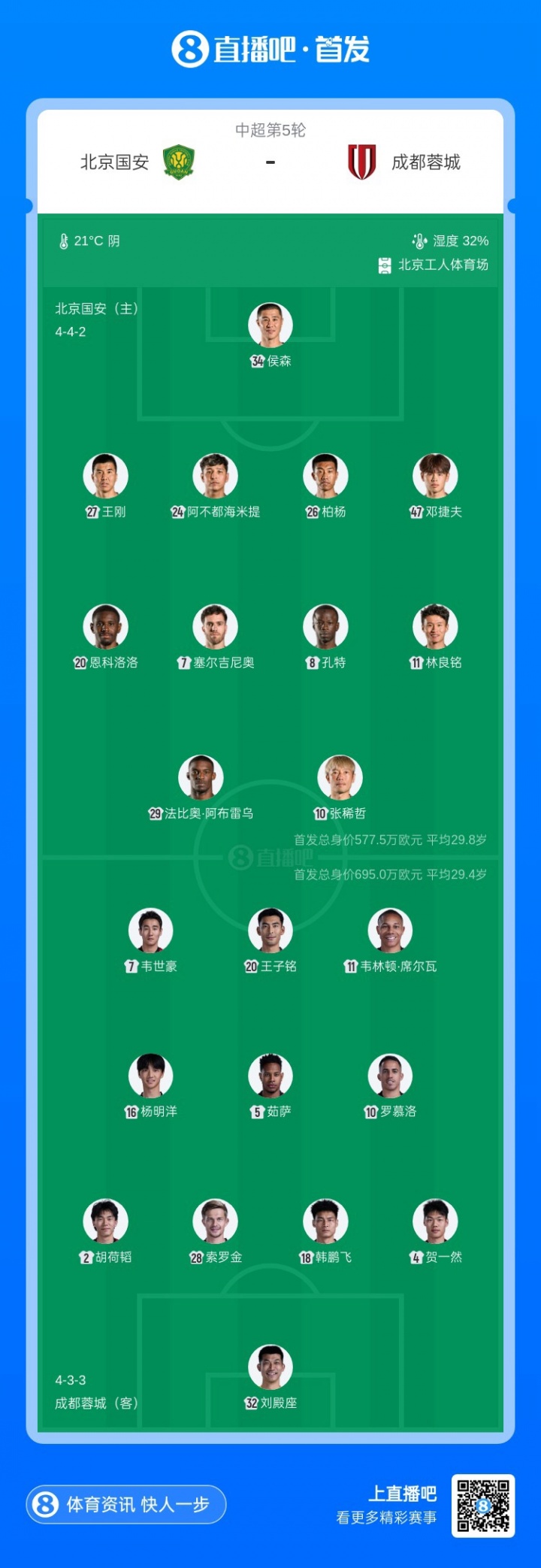 国安vs蓉城首发:3外助PK4外助!侯森、韦世豪出战,张玉宁替补